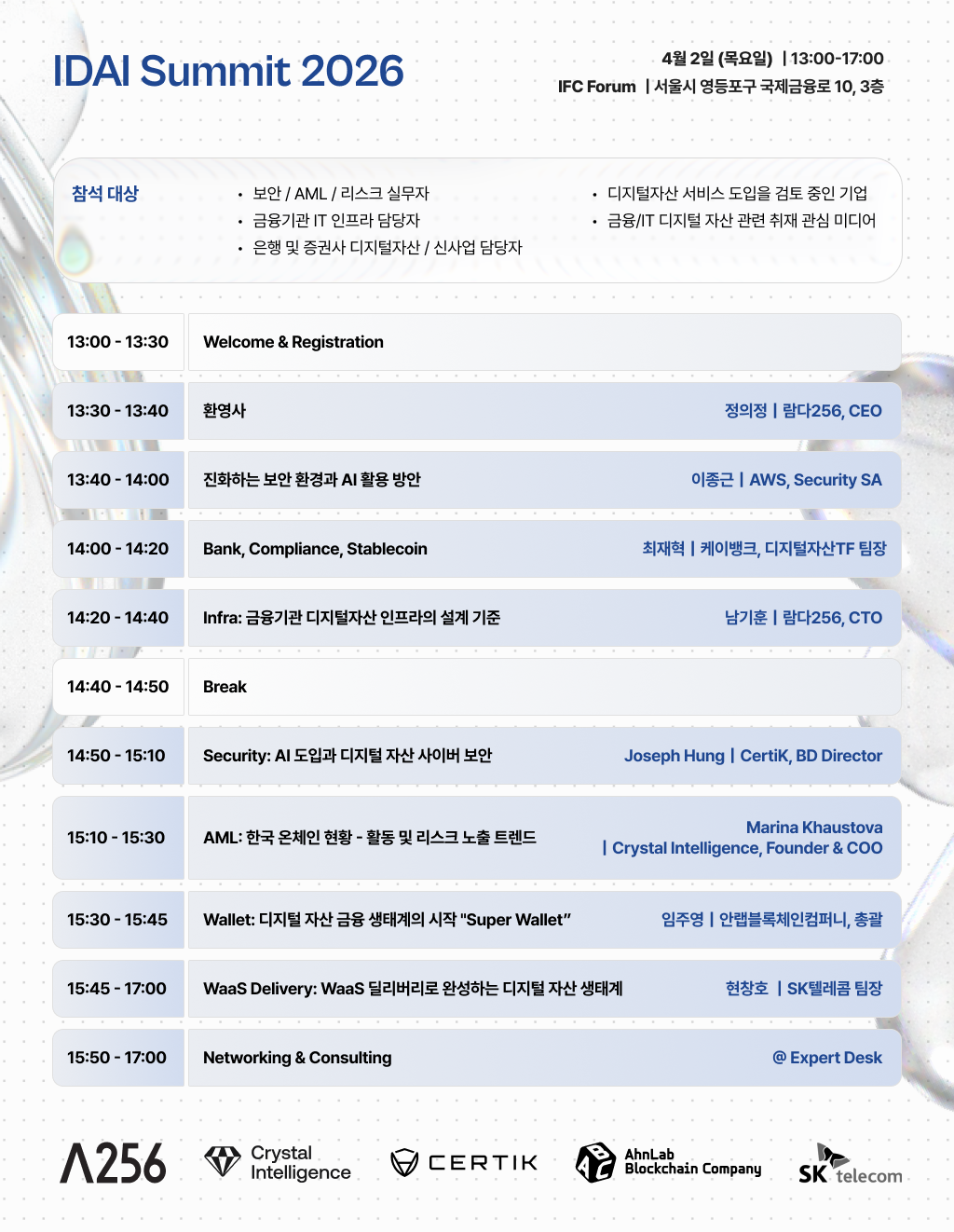 이러한 산업적 변화 속에서 오는 4월 2일에 람다256, Crystal Intelligence, CertiK, 안랩블록체인컴퍼니(ABC)와 SK텔레콤이 디지털자산 금융 인프라 포럼, IDAI Summit 2026 (Institutional Digital Asset Infrastructure Summit 2026)을 개최할 예정입니다. 이번 행사에서는 디지털 자산 인프라 각 분야의 전문가들이 참여하여 제도 환경과 실제 운영 사례를 기반으로 한 인사이트를 공유하고, 금융기관이 디지털 자산 서비스를 구축하고 운영하는 과정에서 필요한 핵심 인프라 설계 기준과 운영 원칙을 함께 논의할 예정입니다.