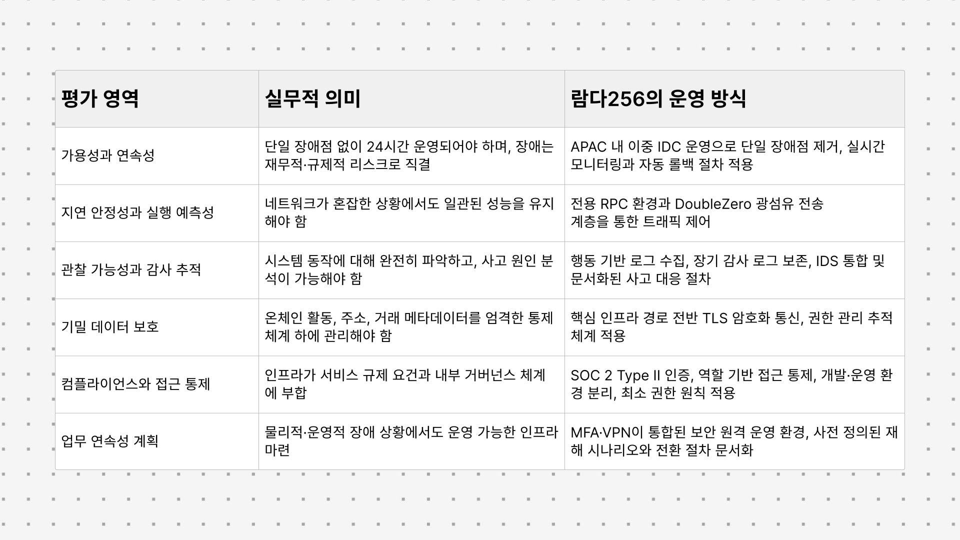 금융기관과 규제 환경에서 운영되는 사업자들이 인프라를 도입할 때 살피는 기준은 명확합니다.